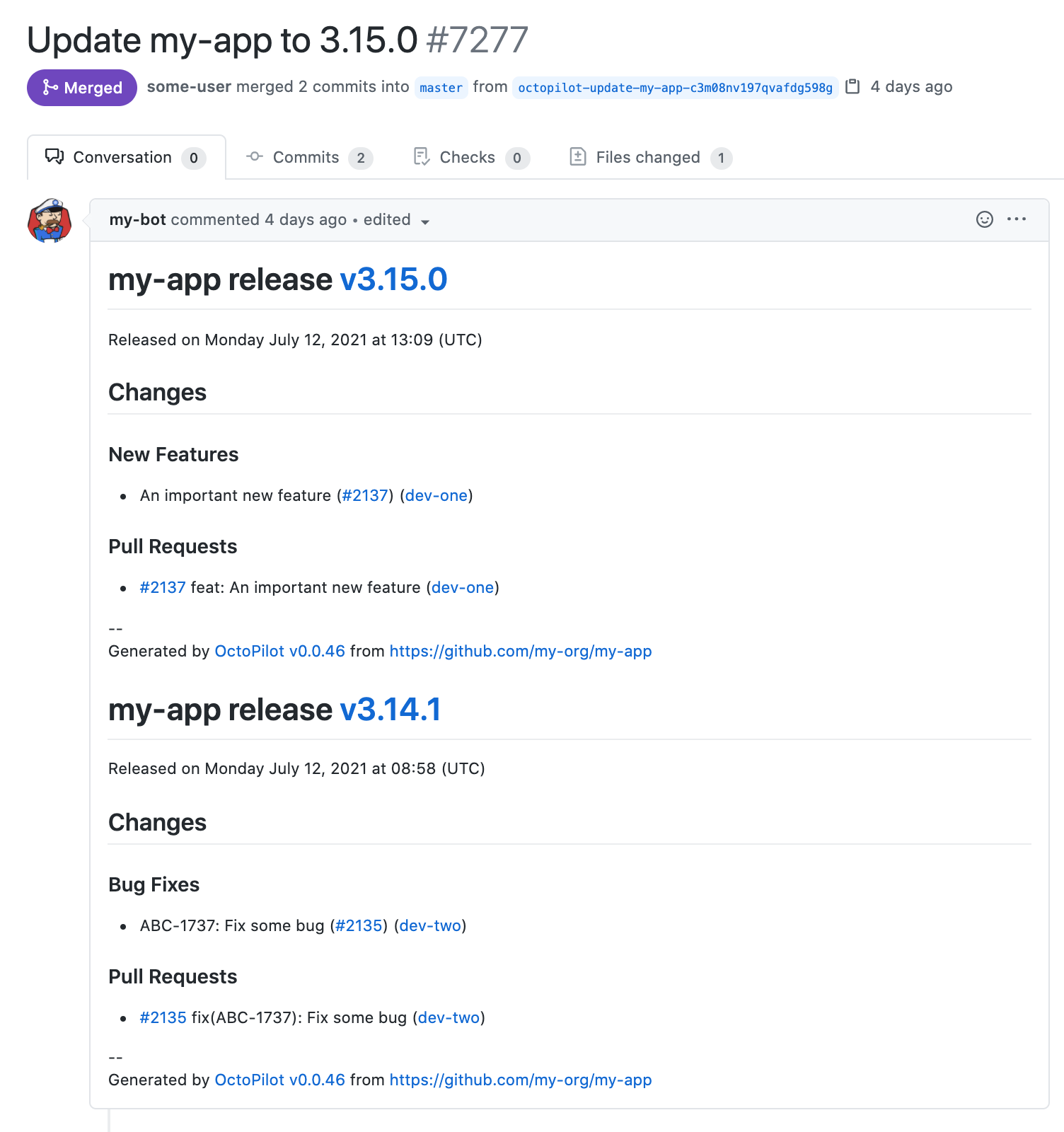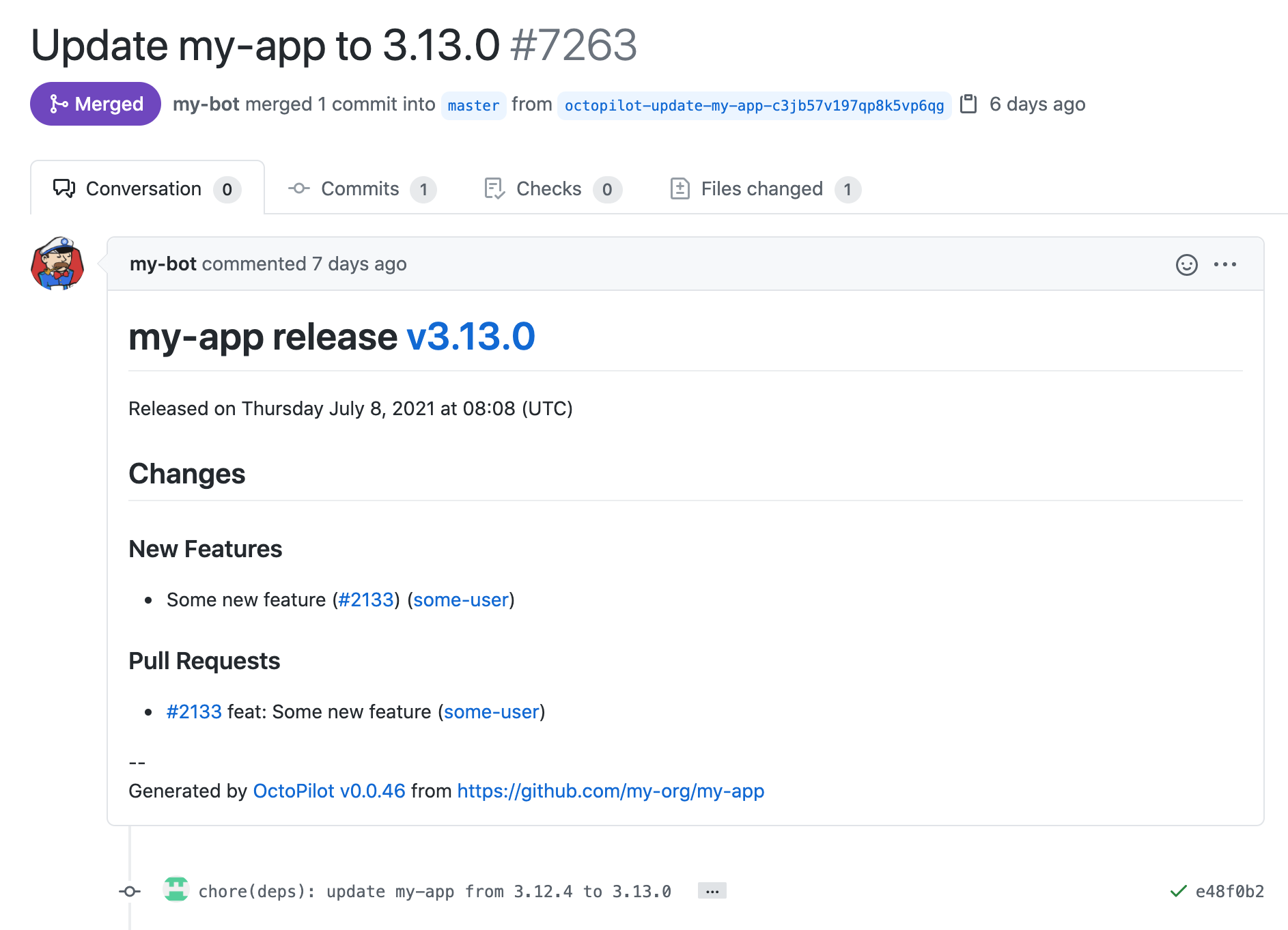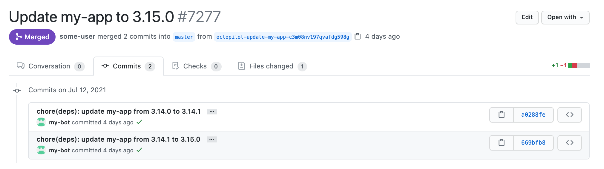 After running all the updaters, octopilot will commit the changes on each repository. You can control which files will be committed, and how the commit will be created, using the Octopilot’s CLI flags.